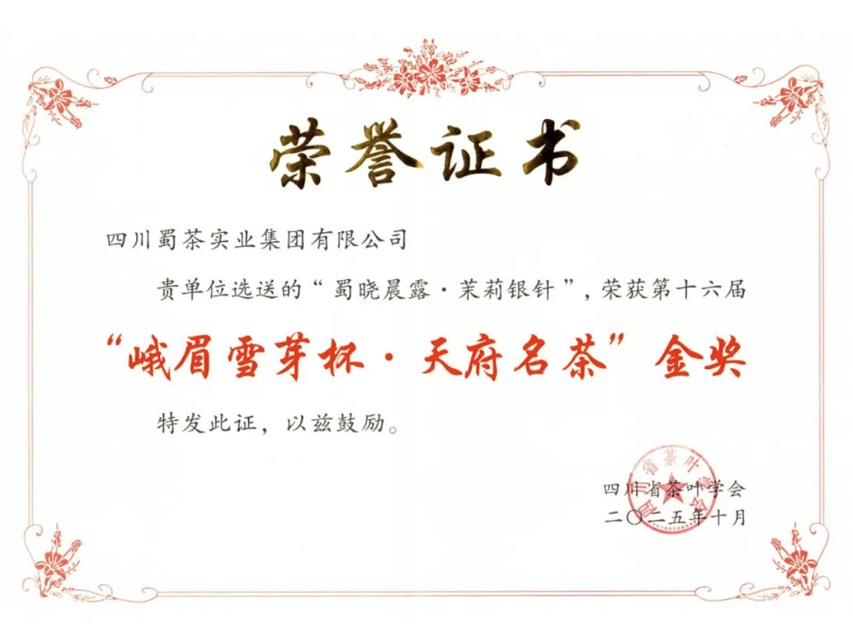 近日,由四川省茶叶学会主办,四川省园艺作物技术推广总站、四川省农业科学院茶叶研究所、四川农业大学联合支持的第十六届“峨眉雪芽杯・天府名茶” 评选活动圆满落幕,蜀茶集团选送产品“蜀晓晨露·茉莉银针”荣获“峨眉雪芽杯・天府名茶” 金奖。