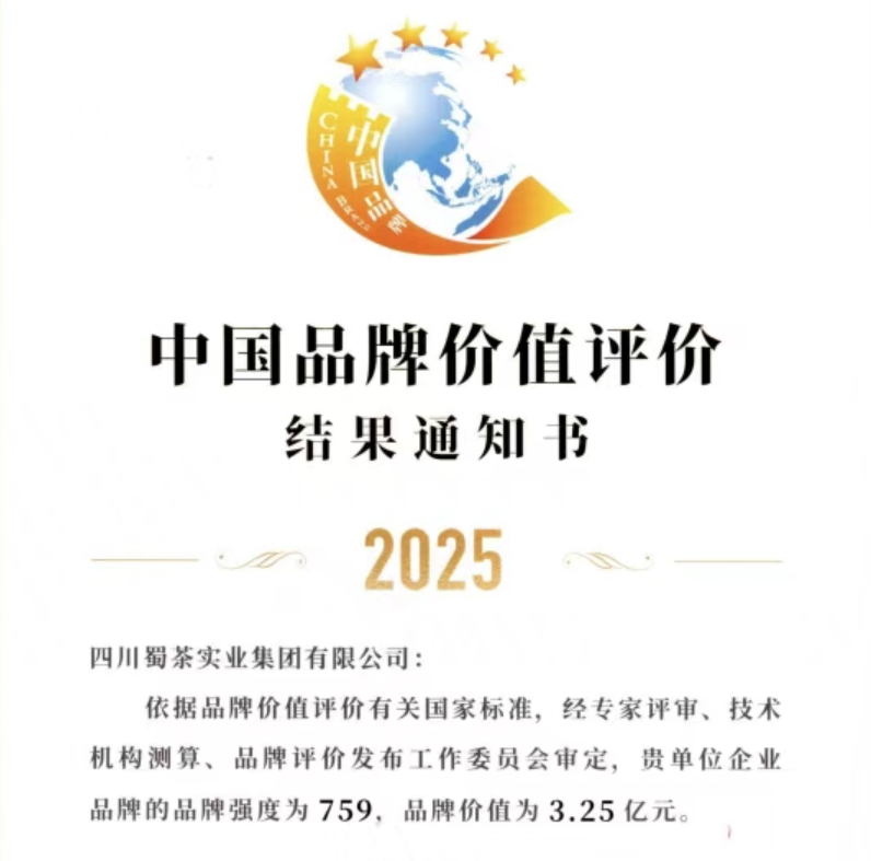 近日,由中国品牌建设促进会、中国资产评估协会主办,新华社品牌工作办公室、《中国品牌》杂志社等单位承办的“2025中国品牌价值评价信息”在浙江德清正式发布。经专家评审、技术机构测算、品牌评价发布工作委员会审定,蜀茶集团品牌的品牌强度为759,品牌价值为3.25亿元。